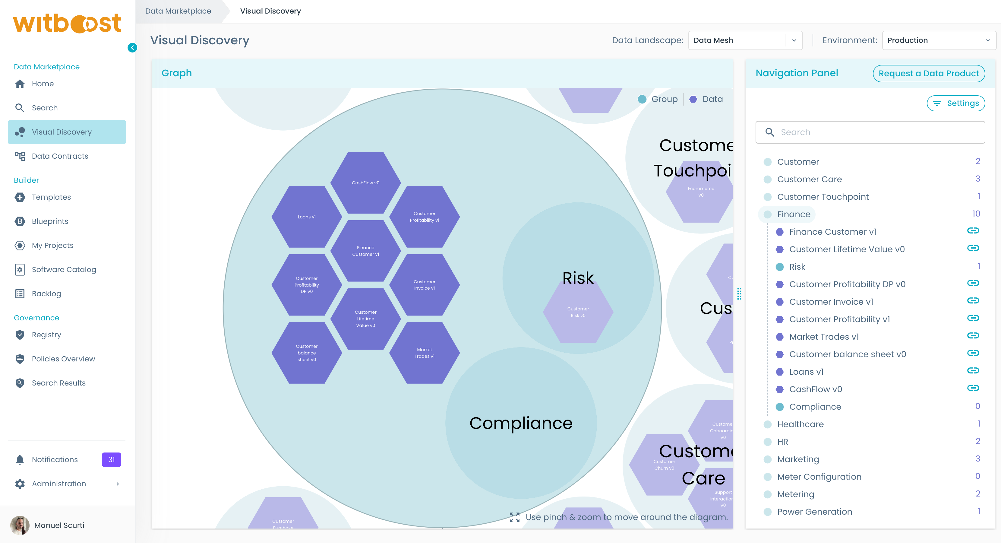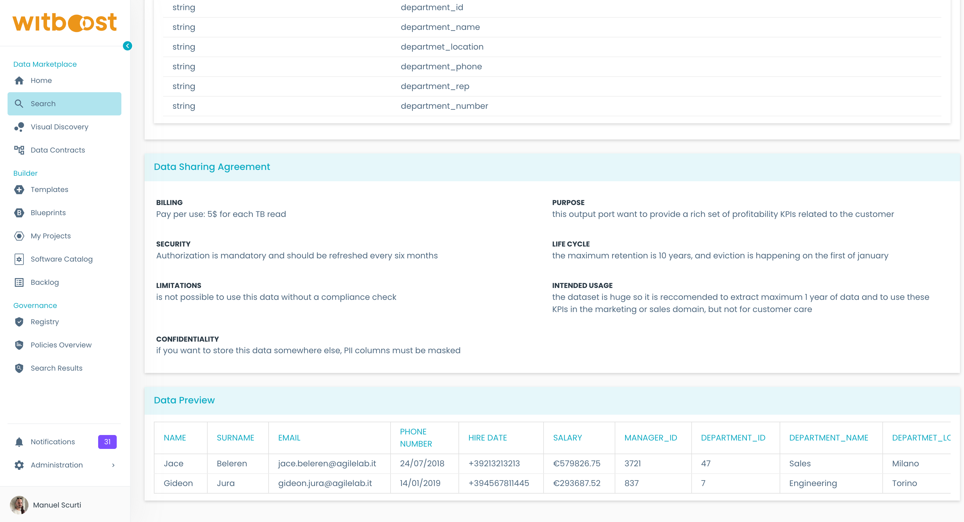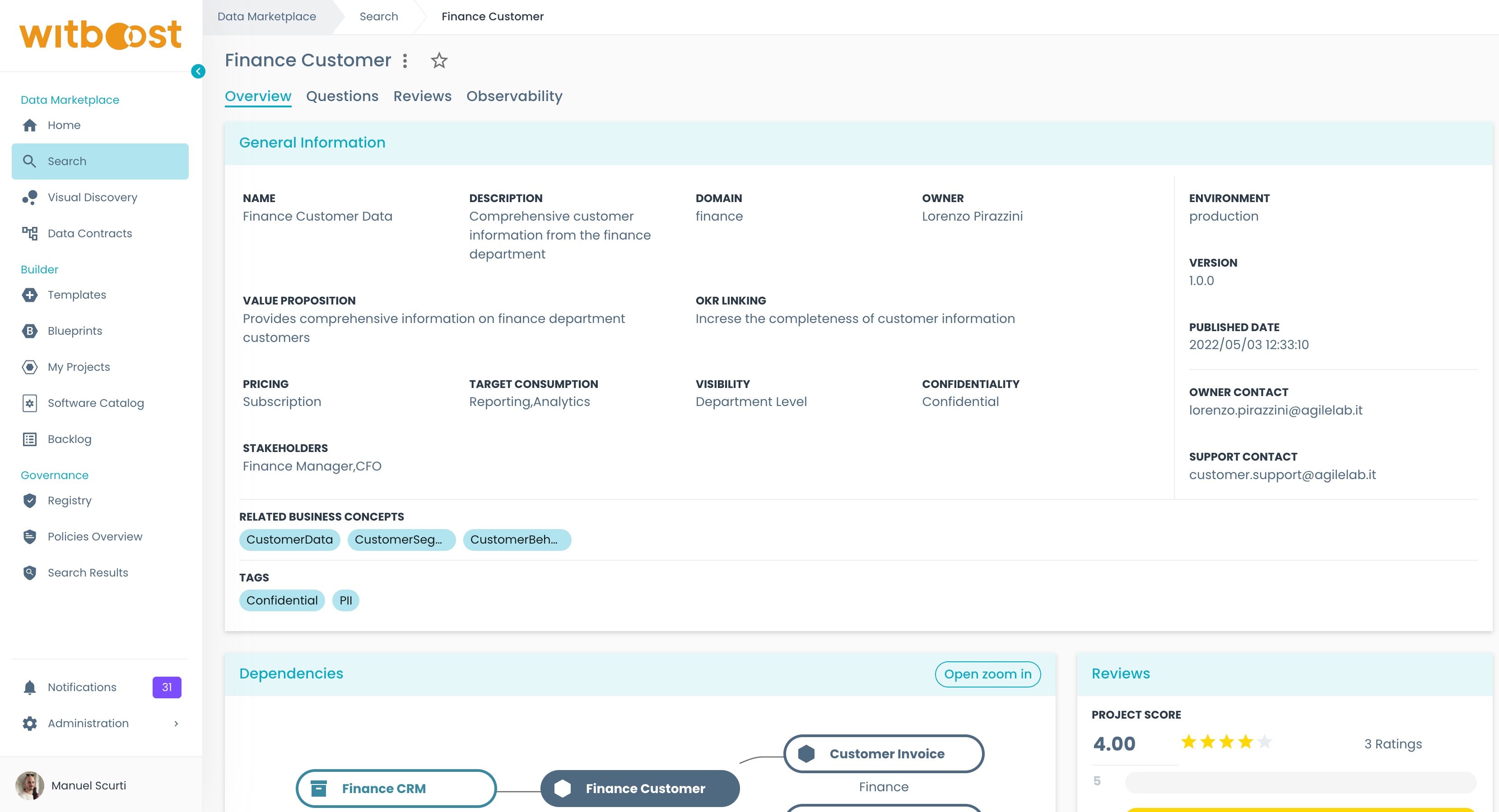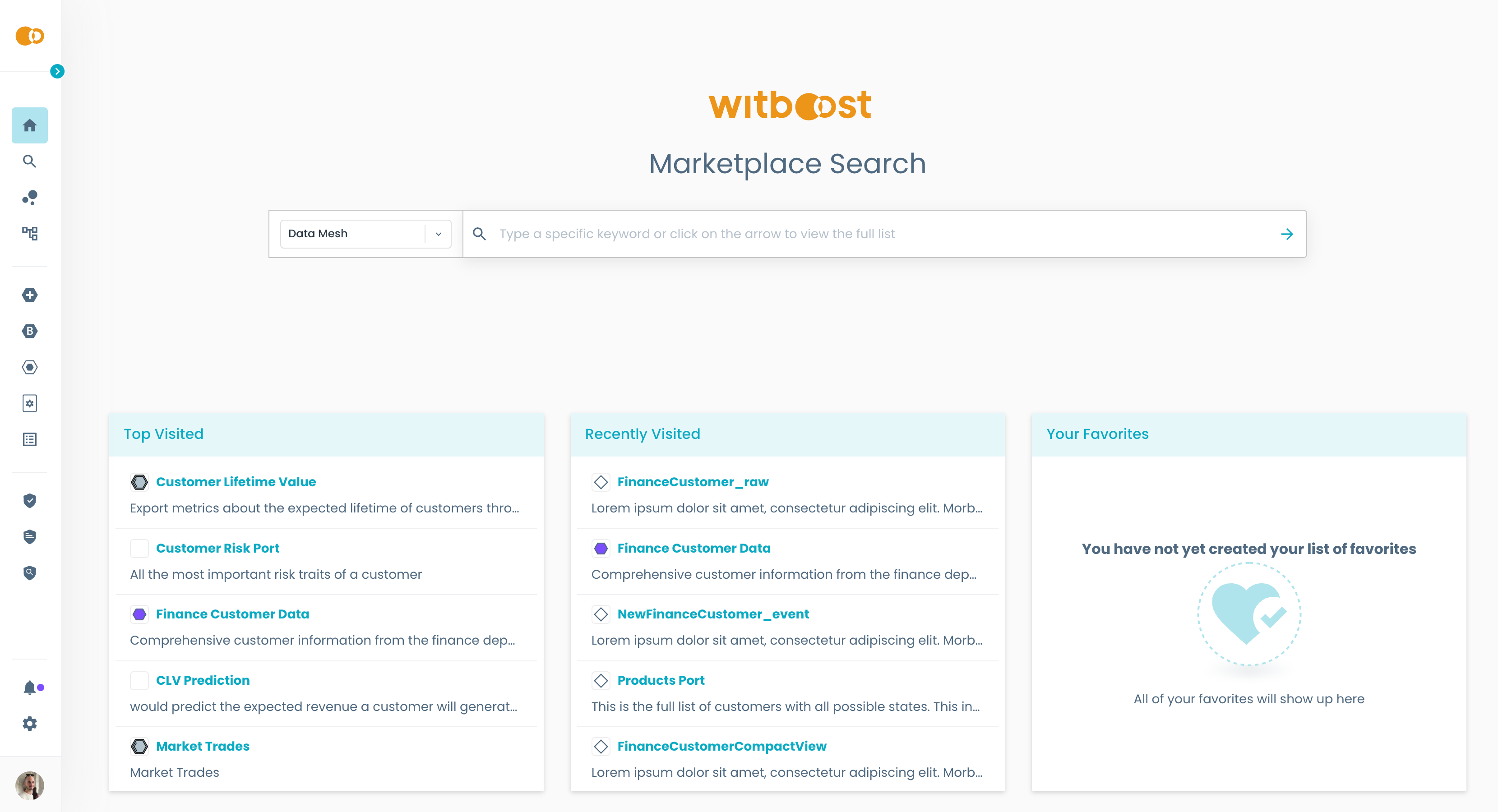 The Witboost Marketplace is a central catalog of published products that you can use to search or discover data assets that fit your business case. What ends up in the marketplace is guaranteed to be compliant to the compliance checks and quality guardrails required by the Governance team at your company.