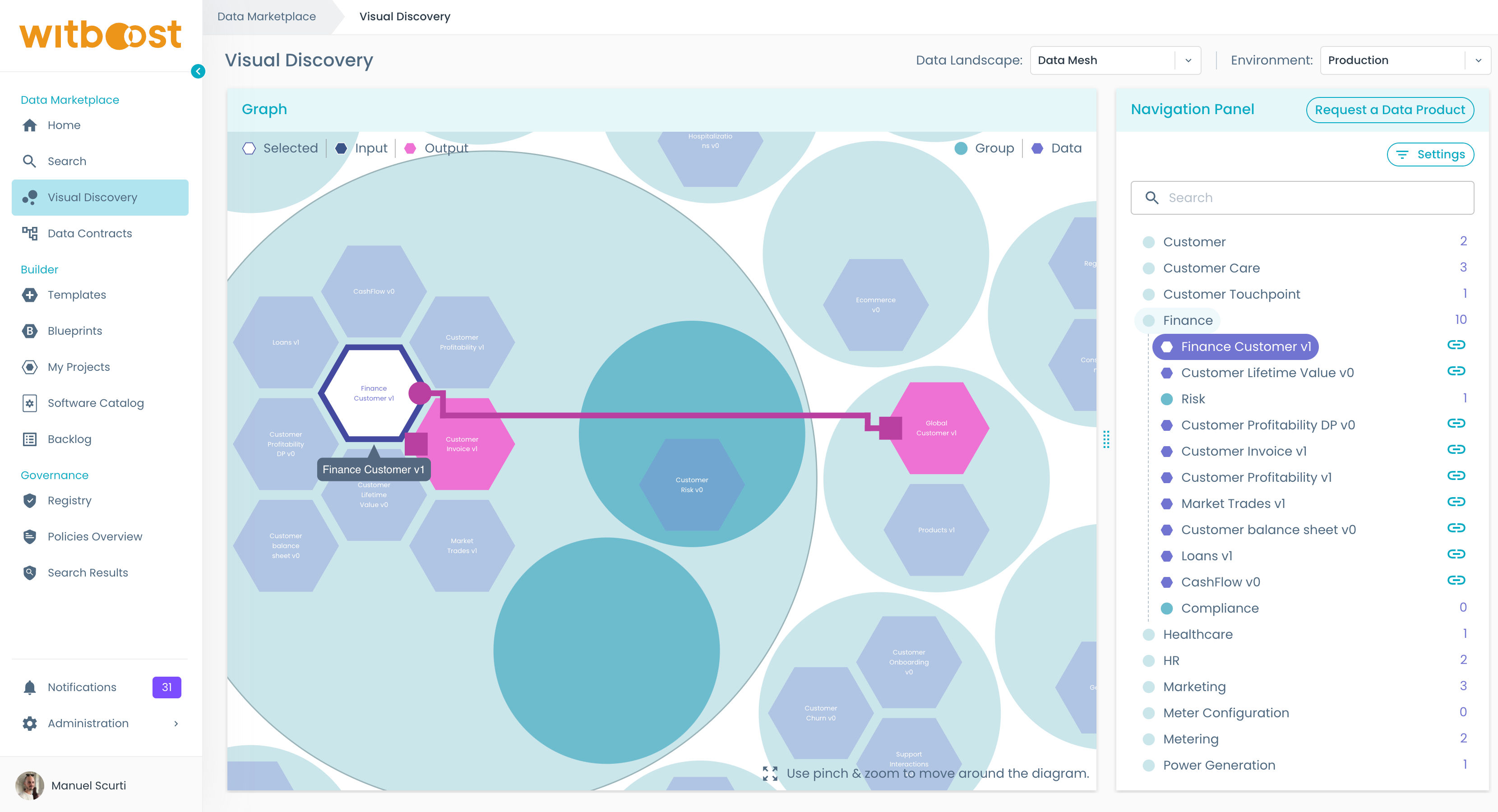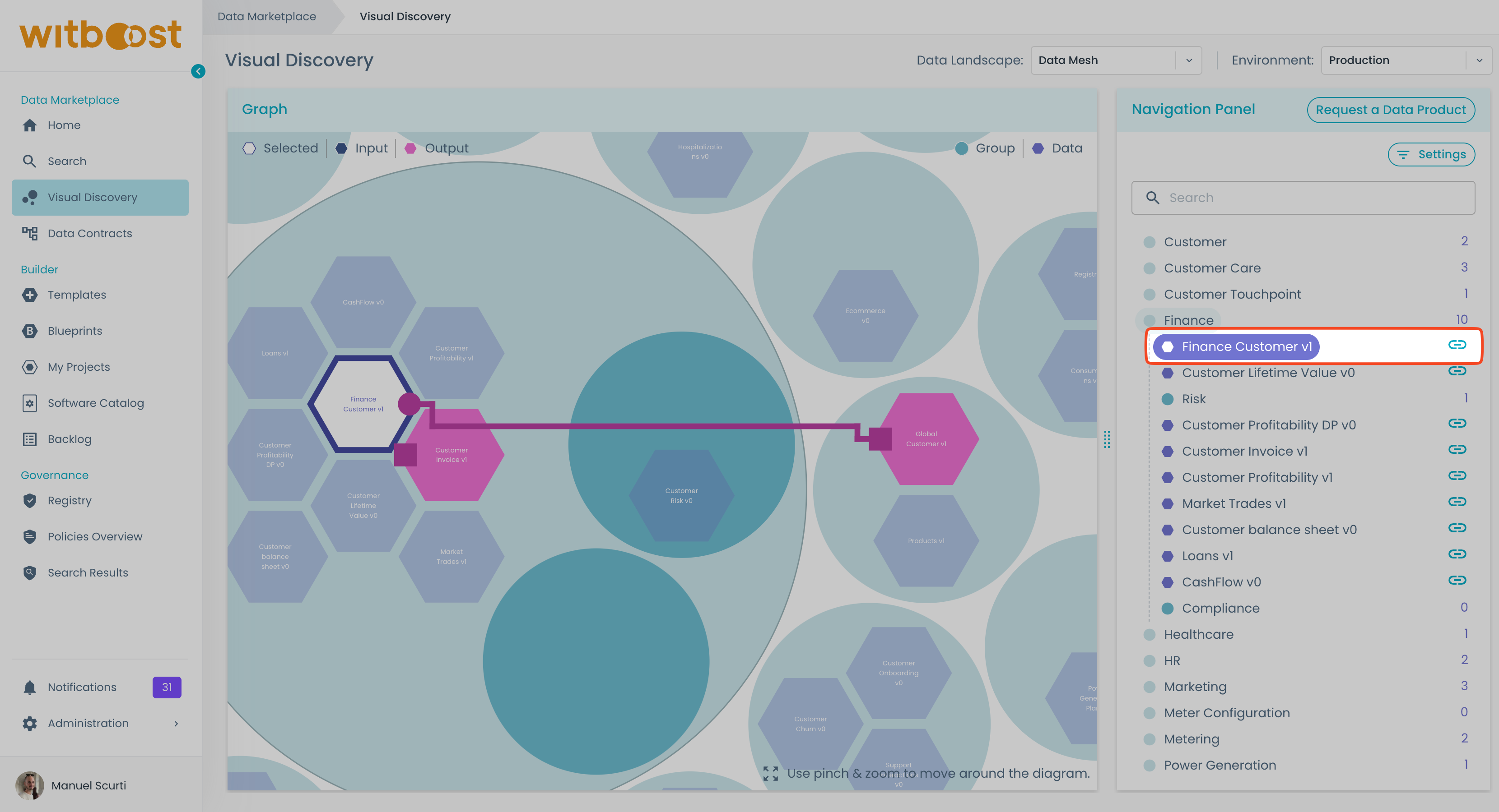 1. We want to get more information about the Finance Customer v1 product, so we click on the hexagon.