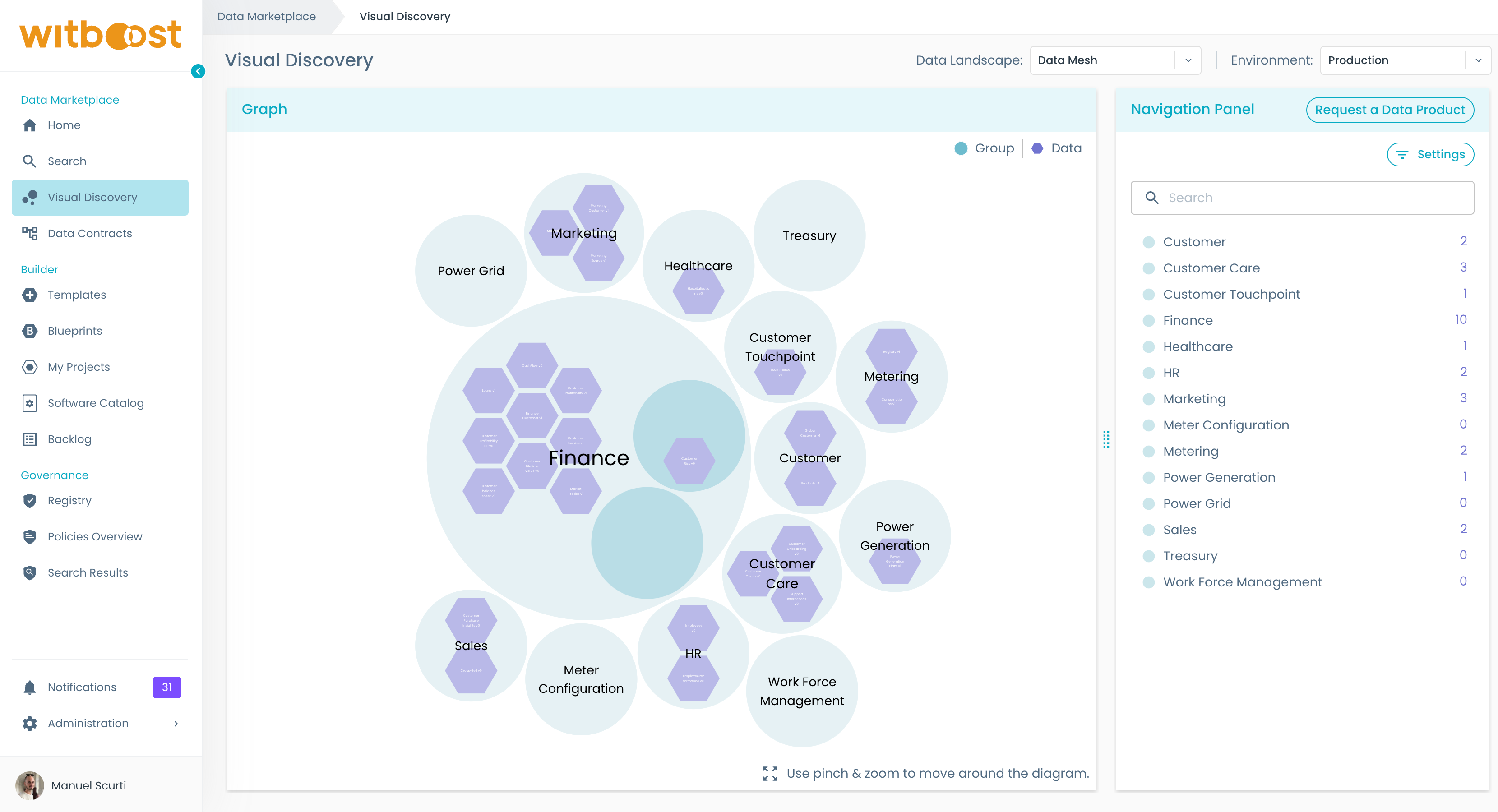 1. Look around for the domain you are interested into. In this example, we want to take a look at products published by the Finance business domain. To zoom in, click on the Finance bubble.